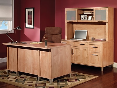 This expansive workspace offers plenty of room to spread out and complete large projects. Available in storm gray ash gray mocha cherry maple cross and hansen cherry this collection of home office desks and storage cabinets complements any workspace. The spacious desktop offers plenty of room to spread out with a computer and paperwork and includes a convenient wire management grommet to keep cords and cables secure and out of sight.